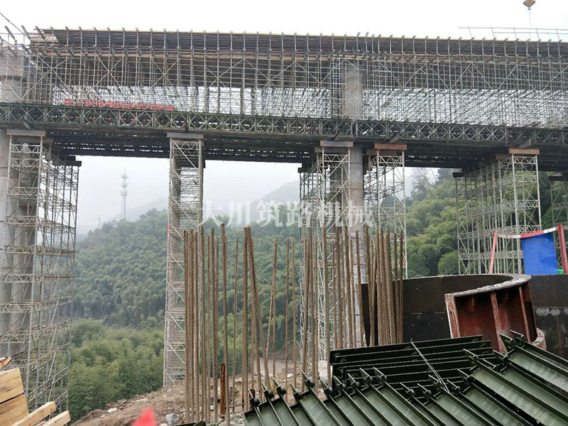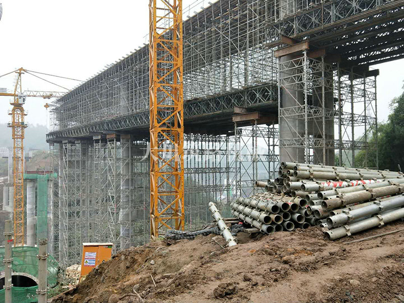 特點:現(xiàn)澆梁支架平臺的跨度大,高度高,使用的貝雷片數(shù)量達(dá)到1808片,加強(qiáng)弦桿2800根,工程于2017年9月開始施工。