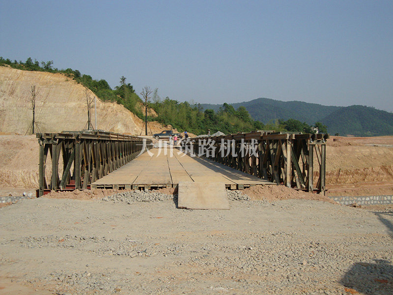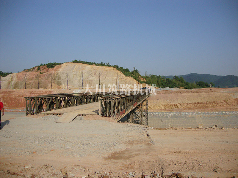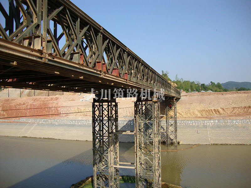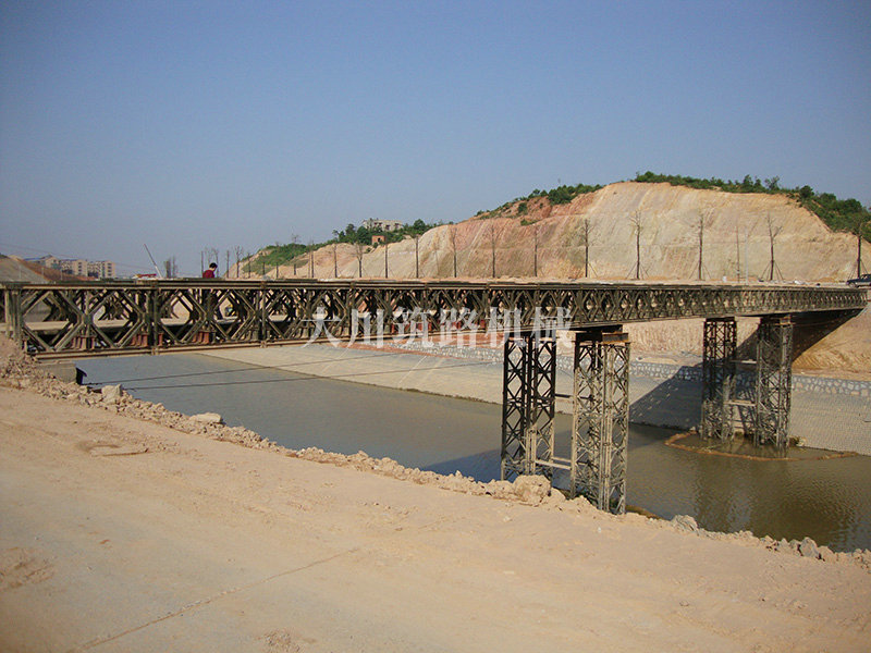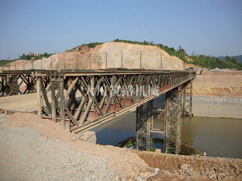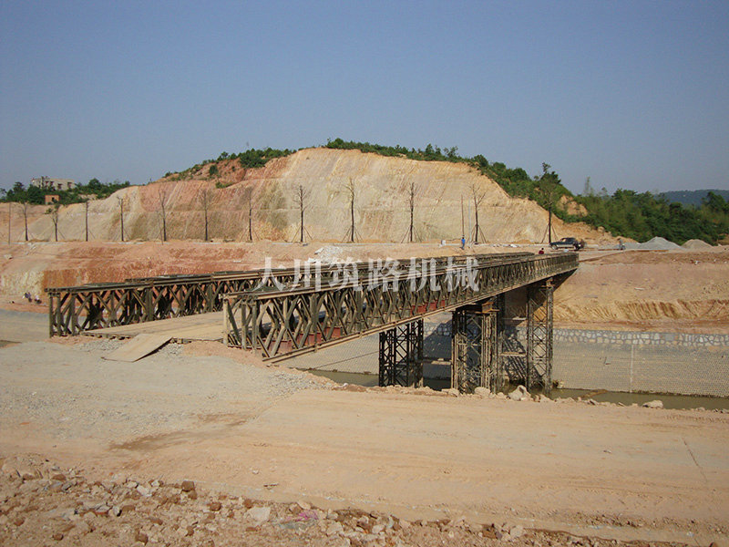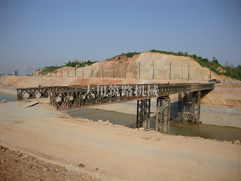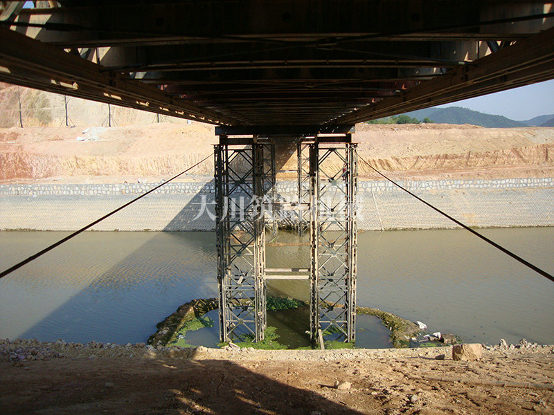 特點(diǎn):本鋼橋由國(guó)防科技大學(xué)全程指導(dǎo)和監(jiān)督安裝,滿足荷載80T施工車輛通行,因施工場(chǎng)地要求,采用貝雷梁組合式橋墩,安裝拆除方便,穩(wěn)定性好。采用推出法安裝,安裝周期20天,于2011年5月25日通車。