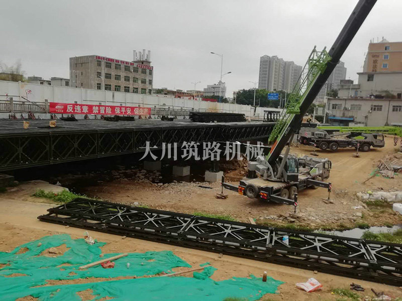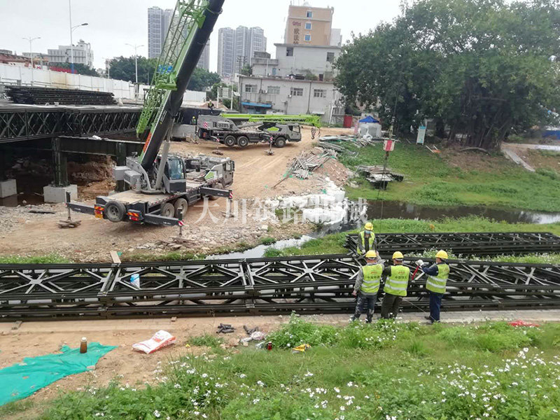 鋼橋型號(hào):48m*16m加強(qiáng)型6(車道)+2(人行通道)+防撞護(hù)欄,上承式鋼橋,橫向布置35排貝雷梁,分兩跨,橋墩為單排四柱式φ800鋼管樁,上表鋪混泥土。